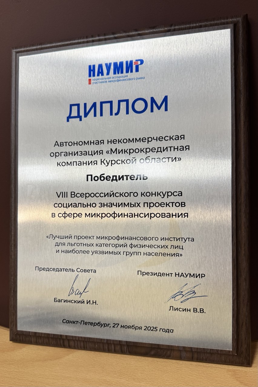 По итогам VIII Всероссийского конкурса социально значимых проектов среди российских микрофинансовых институтов дипломом победителя в номинации «Лучший проект микрофинансового института для льготных категорий физических лиц и наиболее уязвимых групп населения» награждена микрофинансовая организация Курской области, входящая в структуру Центра «Мой бизнес».