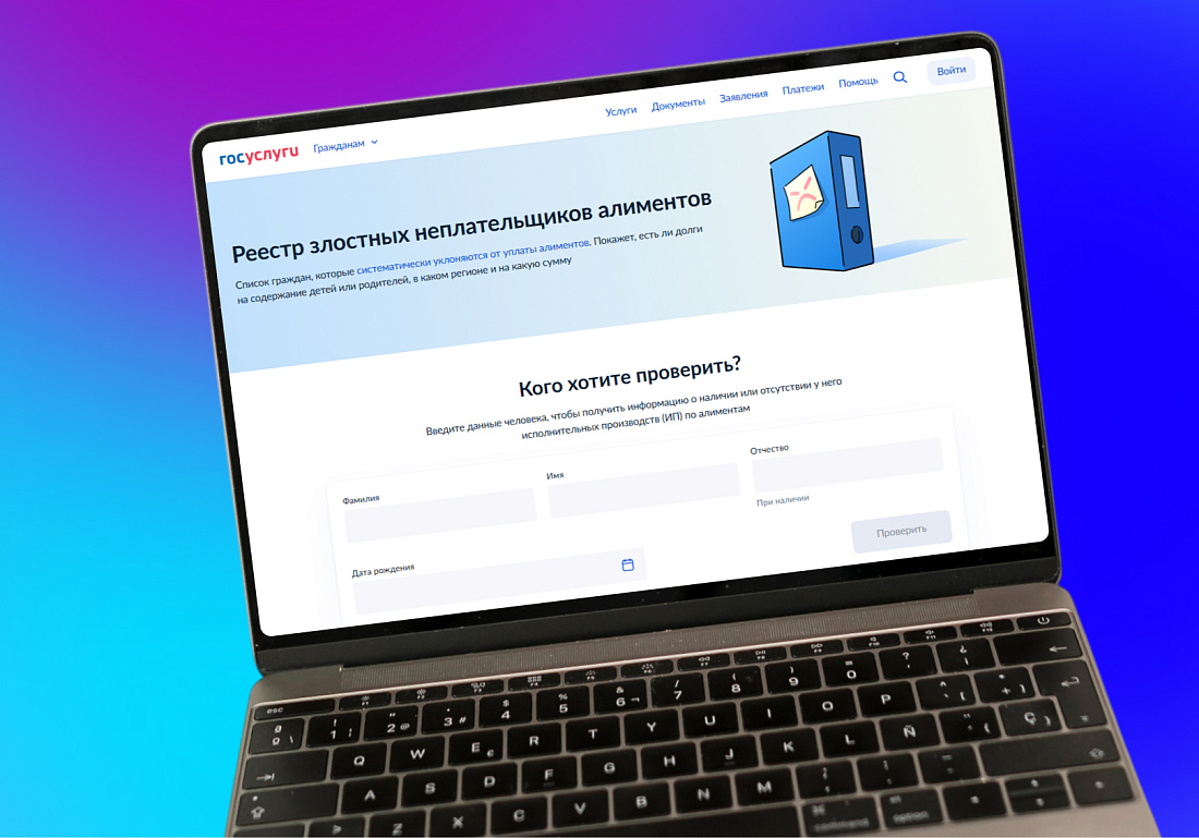 На «Госуслугах» доступен новый сервис - реестр злостных неплательщиков алиментов. Здесь можно проверить наличие задолженности по выплатам на содержание несовершеннолетних детей или престарелых родителей, уточнить регион проживания должника и точную сумму долга. Развитие цифровых сервисов продолжается в рамках федерального проекта «Государство для людей» и национального проекта «Экономика данных».