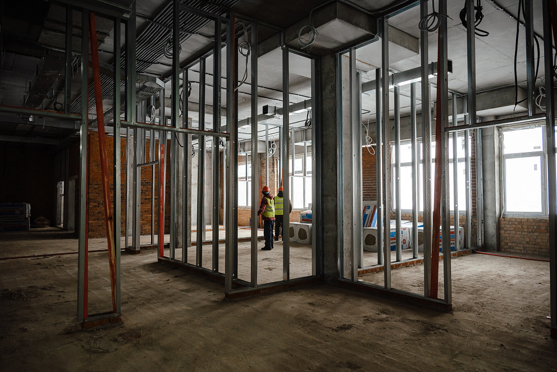 В настоящее время на площадке ежедневно работают 197 человек, готовность объекта составляет почти 50%. Строители завершают монтаж витражей и окон, ведут прокладку инженерных сетей, подключили отопление. Со следующей недели начнутся отделочные работы.