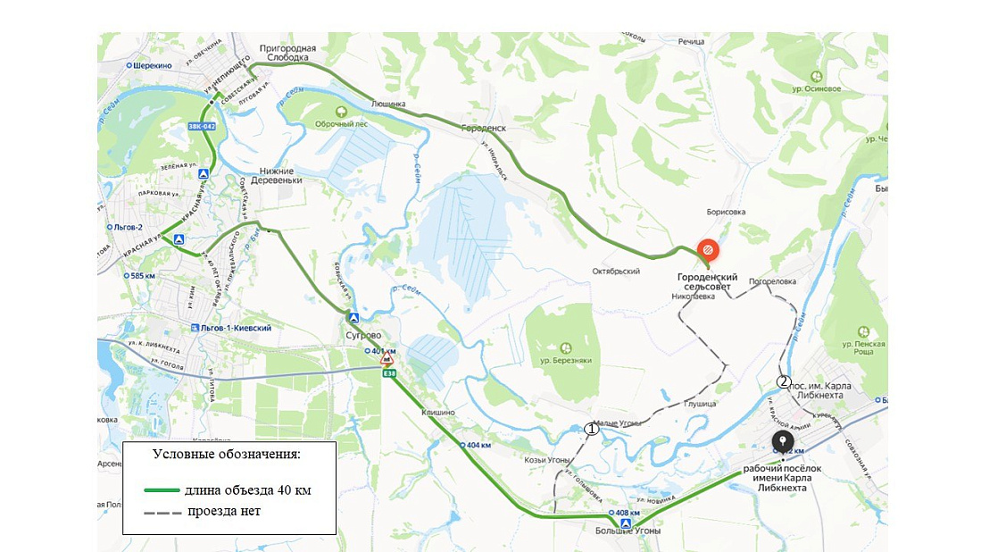 На период паводка объезд данного участка организован через город Льгов. Схема маршрута представлена на карточке.