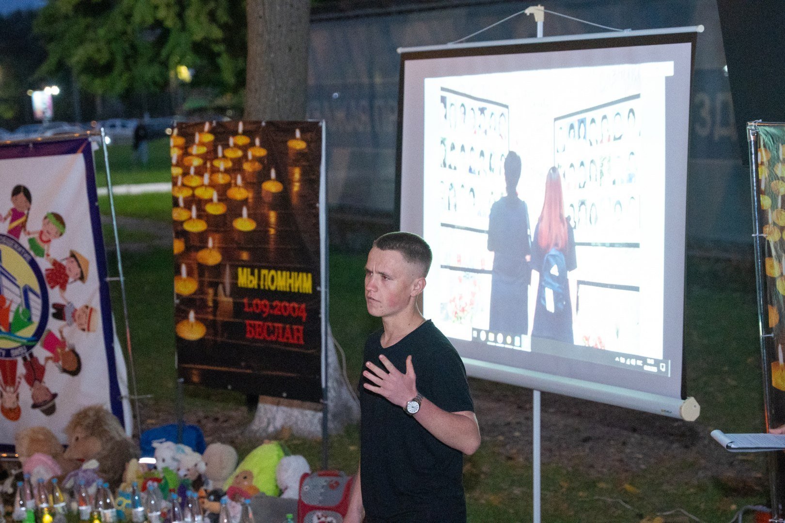 На протяжении всего мероприятия на экране демонстрировался видеоролик о жертвах трагедии, а также документальные кадры, напоминая о страшных событиях 2004 года.